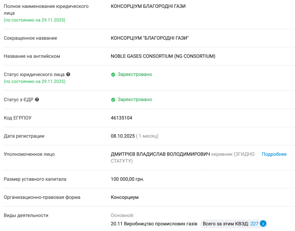 Главный (и, по сути, единственный) претендент – Консорциум «Благородні Гази». Создан 8 октября 2025 года – за 23 дня до объявления тендера.